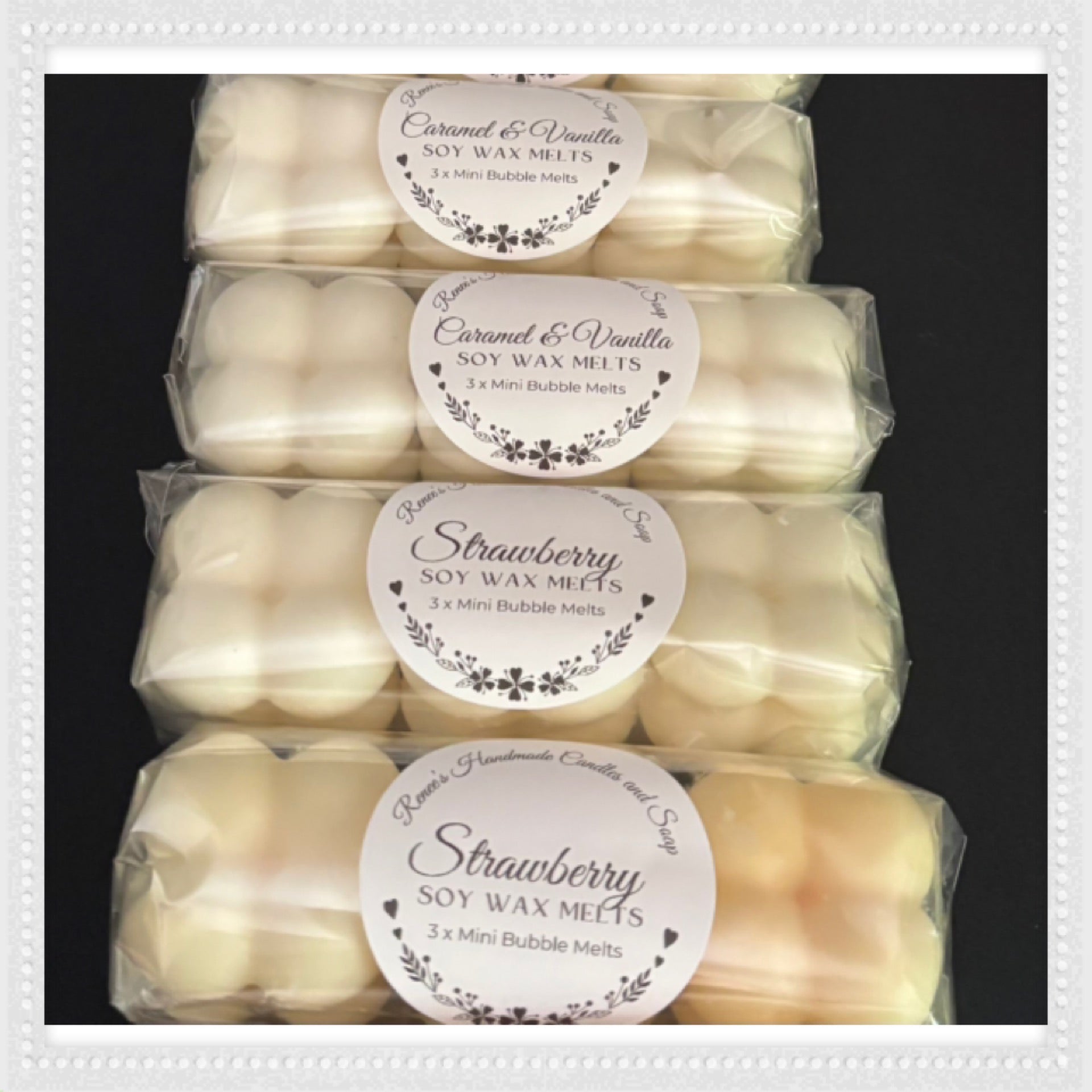 Indulge in the sweet aroma of Caramel & Vanilla or Strawberry Mini Bubble Wax Melts!